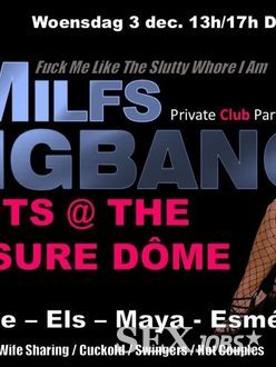 De Milfs sletjes ontvangen je graag in de vurigste Pleasure Dôme uit de streek waar al je fantasieën werkelijkheid worden en waar je je lusten kan de vrije loop laten net zoals de sletjes. Gedurende 4 uur genieten a volonté van stomende seks, drankjes, hapjes, enz.