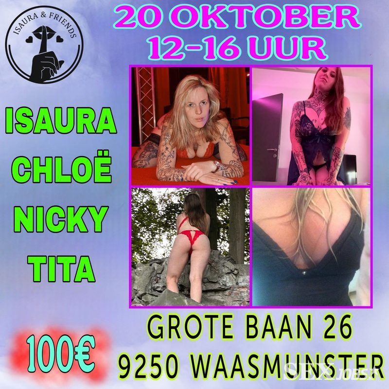 Heb je zin in een geil gangbang feestje met 4 meiden die van aanpakken weten? Mis deze kans dan niet! Pijpen, neuken, klaarkomen in de mond, squirten, ... ja dat zit in het aangeboden pakket van deze 4 toppers! Uiteraard behoren vingeren en beffen ook tot de mogelijkheden. Neuken is enkel met condoom, pijpen kan zonder.