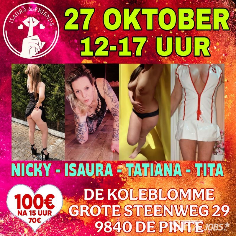 Heb je zin in een geil gangbang feestje met 4 meiden die van aanpakken weten? Mis deze kans dan niet! Pijpen, neuken, klaarkomen in de mond, slikken, squirten, ... ja dat zit in het aangeboden pakket van deze 4 toppers! Uiteraard behoren vingeren en beffen ook tot de mogelijkheden. Neuken is enkel met condoom, pijpen kan zonder.