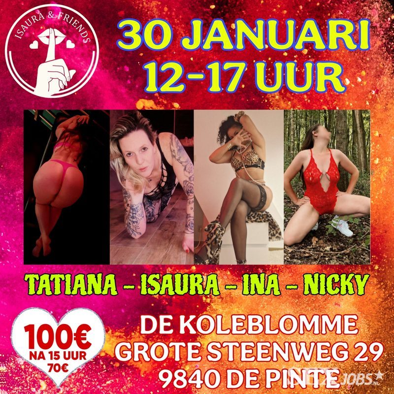 Heb je zin in een geil gangbang feestje met 4 meiden die van aanpakken weten? Mis deze kans dan niet! Pijpen, neuken, klaarkomen in de mond, slikken, squirten, ... ja dat zit in het aangeboden pakket van deze 4 toppers! Uiteraard behoren vingeren en beffen ook tot de mogelijkheden. Neuken is enkel met condoom, pijpen kan zonder.