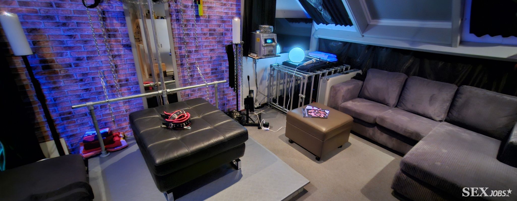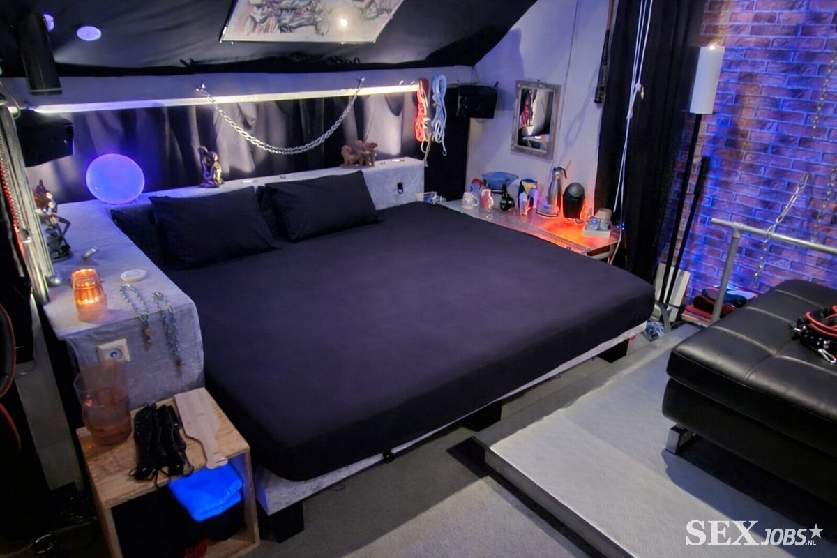 Heb heel veel hulpmiddelen, diverse heerlijke slings, een ruime massage- of behandeltafel, een groot bed (met bijv. volop vastbind mogelijkheden), bankje, zelfs een leuke kooi, neukmachine!, gewoon van alle gemakken voorzien.
