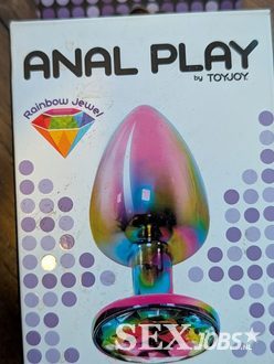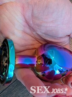 Gekleurde metalen buttplug van Toyjoy. Met juweel aan het uiteinde. Lengte 9,5cm. Doorsnede 4,1cm. Versturen of ophalen.